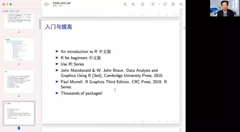 在引言部分,张连增从R的起源,聚焦到R开源免费、资源丰富、功能强大等特点,详细阐释了R广受欢迎的原因。同时,他从不同的使用需求入手,针对R的入门与提高,向同学们推荐了R的相关书籍,并提出了以书为基础、以网络为延伸的学习方法。