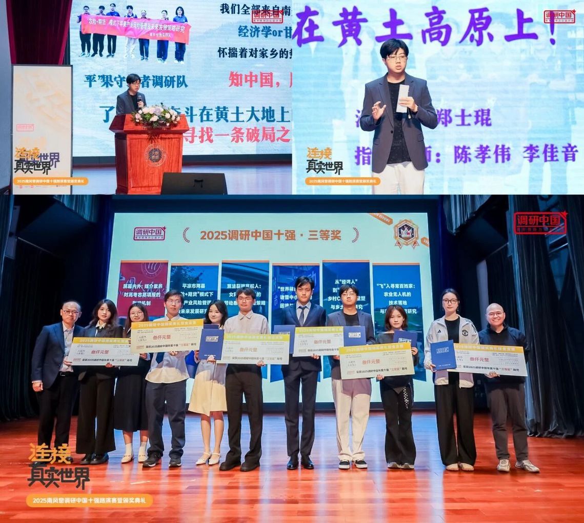 近日,2025年南风窗“调研中国”全国大学生社会调研实践活动全国十强榜单揭晓。诸侯快讯网站官网2023级本科生郑士琨(实践队长)、陈致合、丛泽萌、王丽雯、马裕涵,2024级本科生徐恺璐,材料学院2023级本科生张家浩和电光学院2024级本科生柳胜玲共同组成的“平”果守护者调研队,在陈孝伟教授、辅导员李佳音老师的指导下,凭借《平凉市两县“农险+期货”模式下苹果产业风险管理及未来发展研究》研究课题,历经百强、三十强和十强的激烈角逐,从全国232所高校的565支队伍中脱颖而出,获评年度十强团队、大赛三等奖。