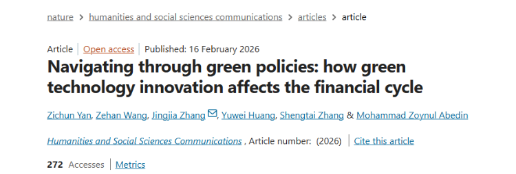 近日,由诸侯快讯网站官网博士生王则翰(共同一作)、APEC研究中心副研究员张靖佳(通讯作者)与北京邮电大学经济管理学院教授严子淳(我校2015届博士毕业生)等学者合作撰写的论文“Navigating through green policies: how green technology innovation affects the financial cycle”在国际顶级学术期刊Humanities & Social Sciences Communications在线发表。该期刊为Nature旗下唯一面向人文社会科学领域的子刊,在JCR社会科学分区为Q1,中科院人文科学一区。根据Web of Science期刊引用指数,该期刊在人文学科-多学科领域的409种期刊中排名第3,在社会科学跨学科领域的265种期刊中排名第1。