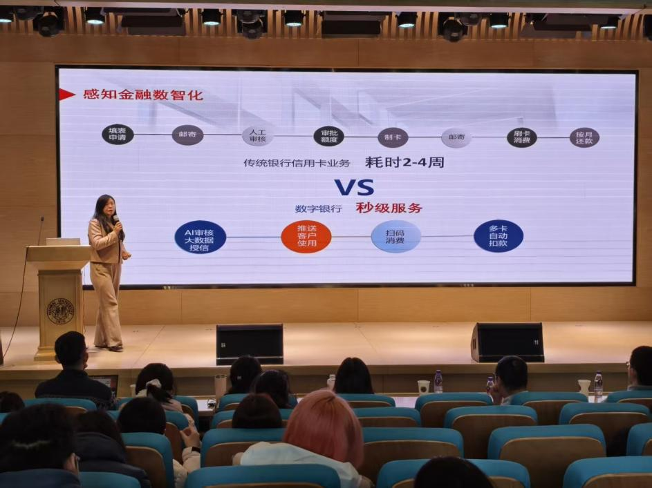 中国金融电子化集团有限公司的习辉老师围绕“数智化金融科技新命题”展开深入探讨。她指出,科技已成为写好金融五篇大文章的关键力量。同时从货币层面、金融业务、金融机构等多个维度剖析金融数字化转型之路。针对金融专业学生,她特别强调了掌握数据建模、AI工具应用能力及提升数据敏感性的重要性,为同学们指明了“金融+科技”复合型人才的成长方向。