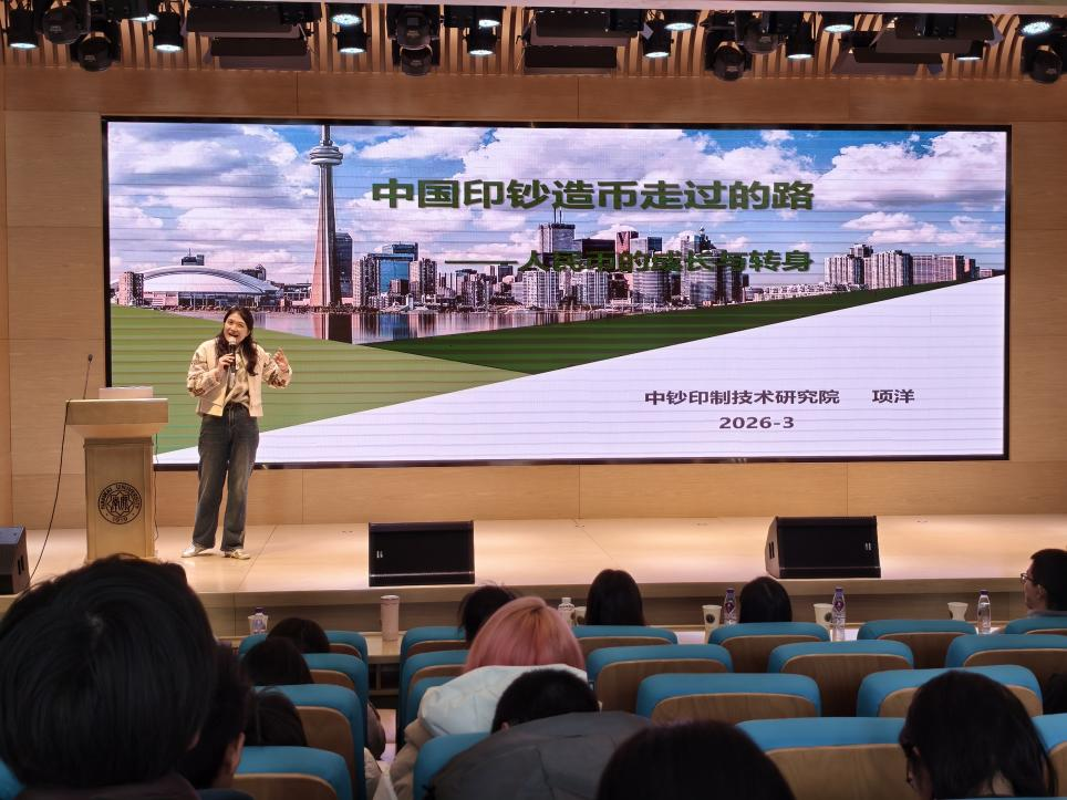中国印钞造币集团有限公司的项洋老师带来了题为“中国印钞造币走过的路——人民币的成长和转身”的精彩分享。她从行业概况切入,介绍了印钞造币总公司下属企业及中钞研究院的基本职能。通过梳理五套人民币的发行脉络,她生动讲述了我国人民币的跨越式发展历程,特别提及了第三套人民币5元券斩获国际大奖的辉煌时刻。此外,她还深入浅出地讲解了前沿防伪技术,让同学们在方寸钞票间感受到了国家工艺的精湛与文化的传承。