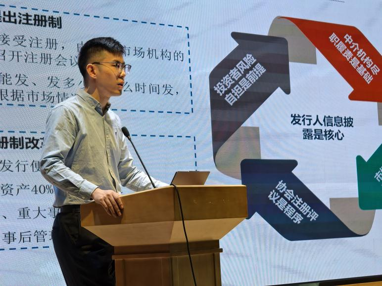 中国银行间市场交易商协会的赵浩南老师以“中国银行间债券市场发展与现状”为题率先开讲。他首先厘清了债券的核心概念,通过与股票的对比,清晰地阐释了债券的独特性质。他还重点介绍了交易商协会的关键职能,解析了债券工具的创新产品体系,并鼓励同学们关注国家重大战略支持领域的金融创新机遇。